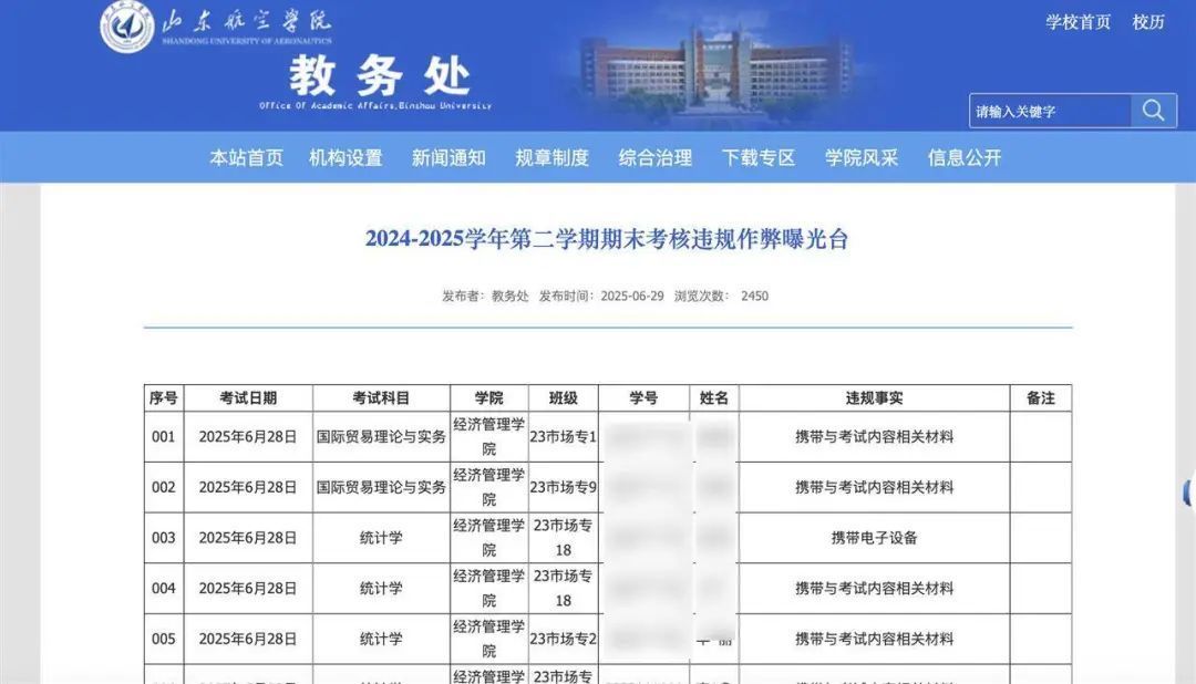 7月2日,记者通过山东航空学院教务处官网查询了解到,6月29日校方公布了“2024-2025学年第二学期期末考核违规作弊曝光台”,涉及的违规作弊学生人数及违规行为,与上述博主发布的名单一致。