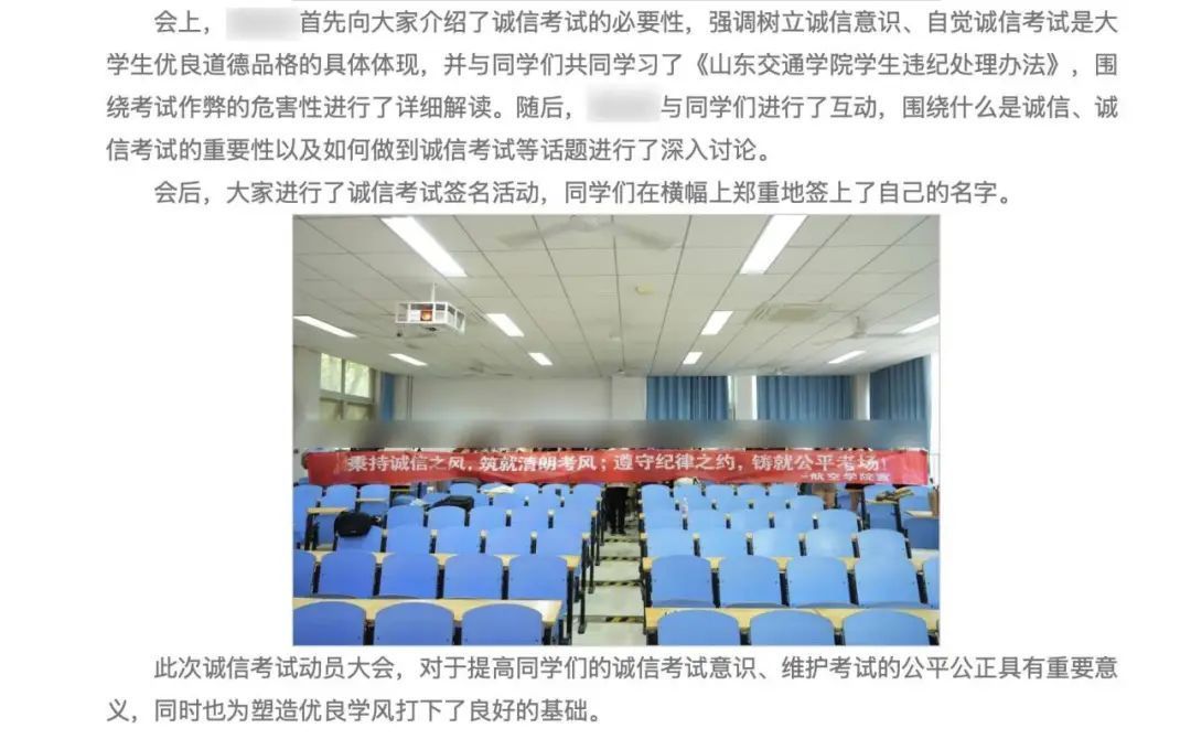记者通过网络检索发现,上述多名学生手持遵守考试纪律的横幅图片确实并非山东航空学院学生,而是山东交通学院航空学院在去年诚信考试动员大会上所拍摄。